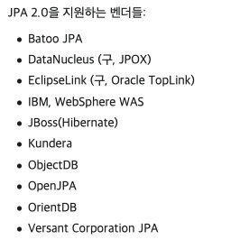- hibernate 이외에도 JPA 지원하는 벤더들도 많이 존재한다.