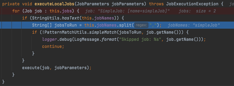 여기서 executeLocalJobs 은 JobName 이 있다면 해당 job을 찾아 실행하게 됩니다.