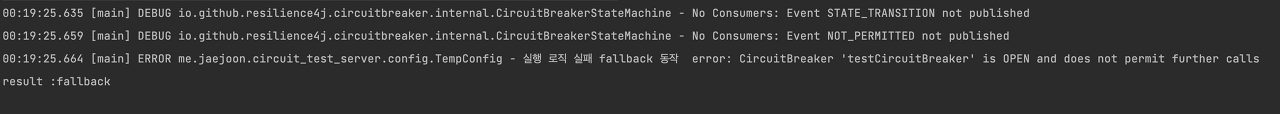 이렇게 error 가 발생하면 앞서 설정한 config 설정대로 집계하다가 실패율 임계치가 넘는 순간 서킷의 상태는 OPEN으로 변경되고 본 로직을 실행하지 않고 바로 fallback 로직을 실행하게 됩니다.