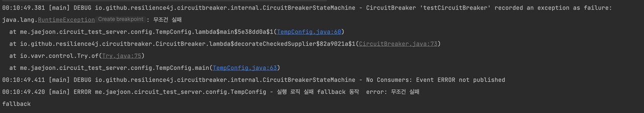 log.error("실행 로직 실패 fallback 동작 error: {}", throwable.getMessage());