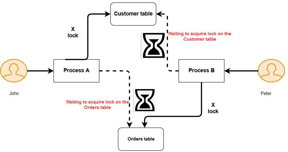 -> 두 개의 프로세스가 서로의 프로세스의 자원을 원하는 경우