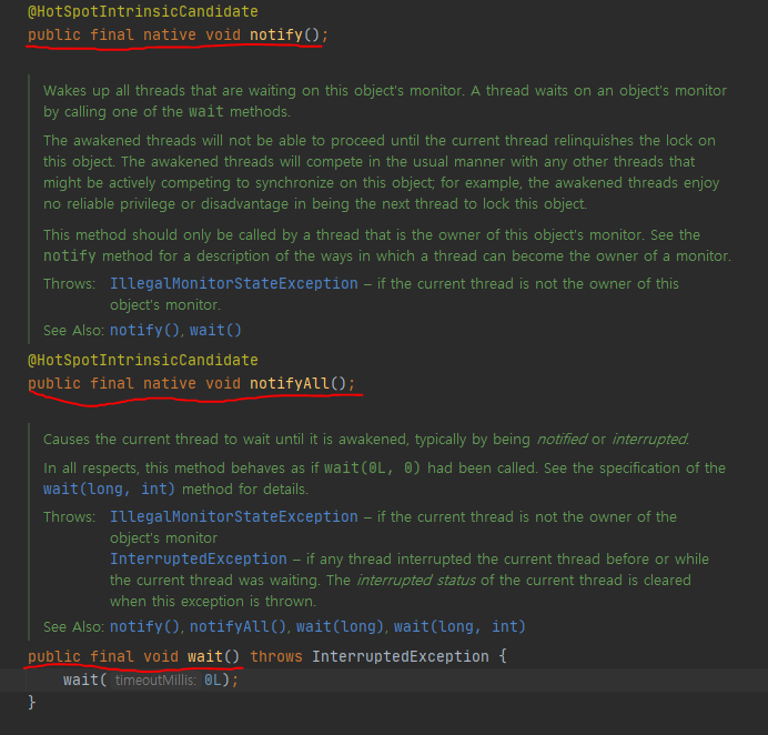 | wait() | 다른 스레드가 이객체의 notify() 를 불러줄 때까지 대기한다. |