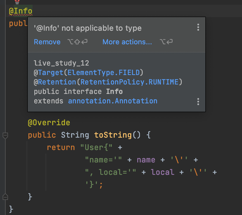 그럼 이번 글에 작성한 info 같은 경우 필드에서만 해당 애노테이션을 허용하고 싶다. 다음과 같이 하면 된다.